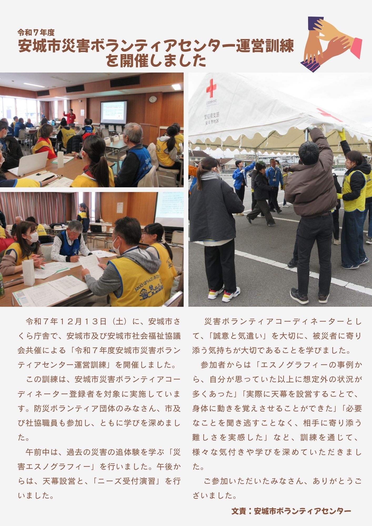令和7年12月13日(土)に、安城市さくら庁舎で、安城市及び安城市社会福祉協議会共催による「令和7年度安城市災害ボランティアセンター運営訓練」を開催しました。