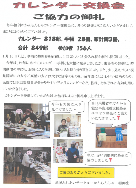 カレンダー交換会 ご協力お礼 投稿日時 : 01/17 桜井福祉センター カテゴリ: カレンダー交換会 大盛況! 1月10日(土)の午前10時から午後2時にカレンダー交換会が開催されました。 ボランティア団体「地域ふれあいサークルかんらんしゃ」の皆さんが丁寧に準備をされて、今年も好評の中、無事終了しました。 交換会のカレンダーや手帳等、収集にご協力いただいた多くの皆様に、感謝申し上げます。 年々、収集量が大幅に減少しています。 次年度開催の際も、カレンダー収集にご協力をよろしくお願いします。 タグ カレンダー交換 ボランティア 連協 安城市 桜井福祉センター 桜井地区 かんらんしゃ サロン