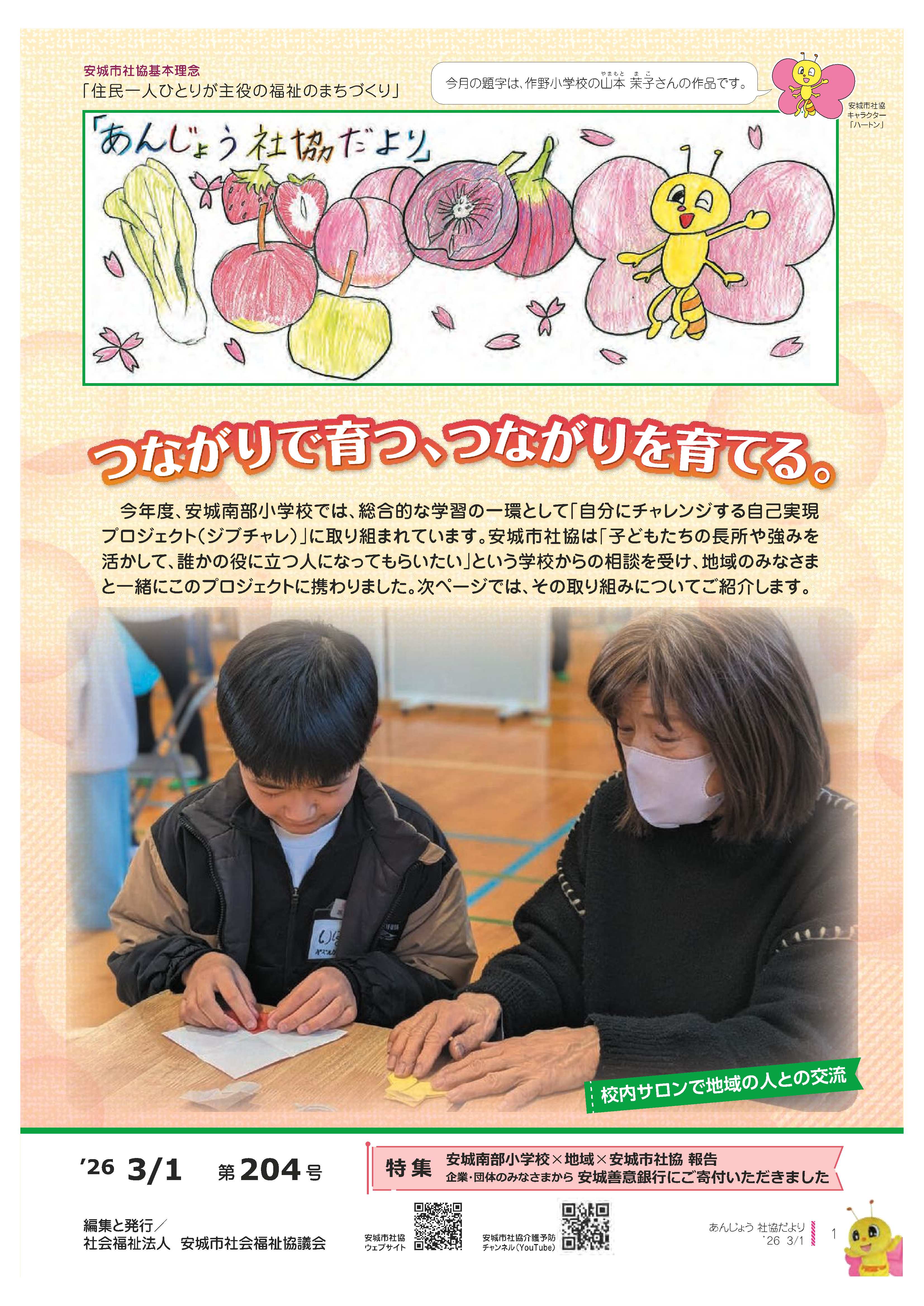 発行日 令和8年3月1日 主な内容 安城南部小学校╳地域╳安城市社協 報告 企業・団体のみなさまから 安城善意銀行にご寄付いただきました ファイル名(形式:サイズ) 社協だより第204号(PDF形式:2.3MB) 広報誌データ ダウンロード サムネイル