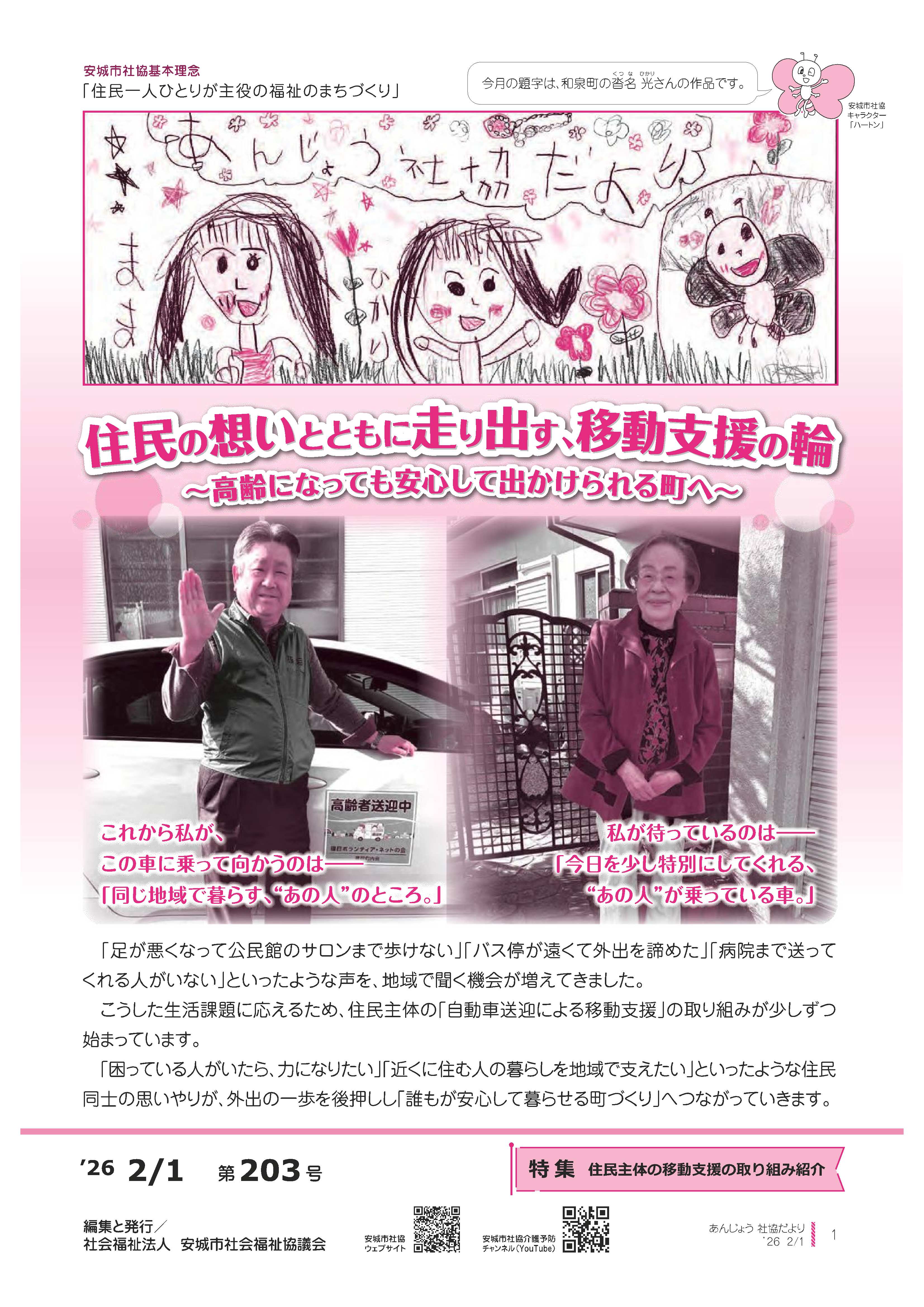 一覧へ 2026年 発行日 令和8年2月1日 主な内容 住民主体の移動支援の取り組み紹介 ファイル名(形式:サイズ) 社協だより第203号(PDF形式:1.9MB) 広報誌データ ダウンロード サムネイル