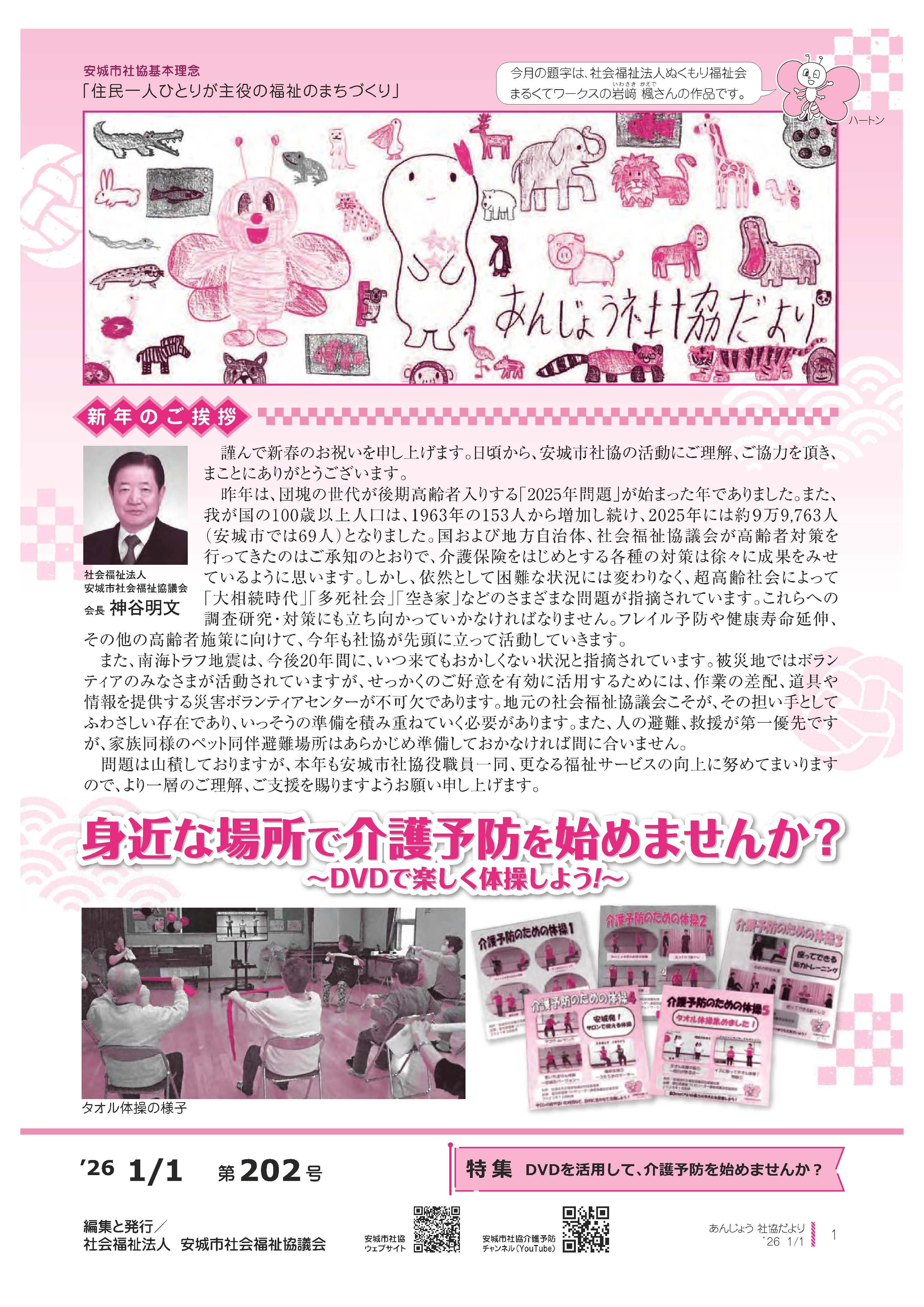 一覧へ 2026年 発行日 令和8年1月1日 主な内容 DVDを活用して、介護予防を始めませんか? ファイル名(形式:サイズ) 社協だより第202号(PDF形式:2.3MB) 広報誌データ ダウンロード サムネイル